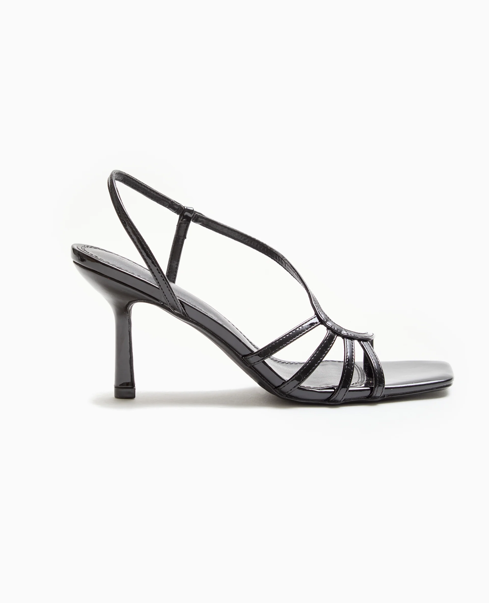 - Sandales à talon noires en matière synthétique effet cuir verni.